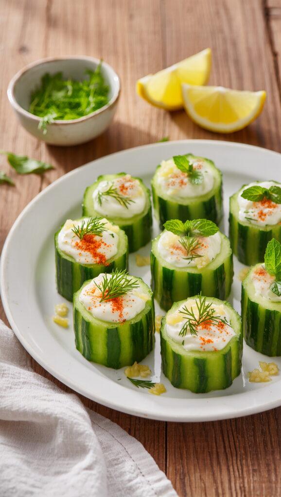 No stove or oven needed here—just a little knife work and a spoon. Hollowing out cucumber slices turns them into edible vessels, and mixing the dip is as easy as stirring. The key is uniformity and care: clean edges on your cucumber cups, and a creamy, well-blended dip make the final presentation pop.